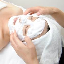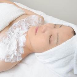 理容師シェービングに加え、濃密な泡洗顔(ラテスパ)をフェイスと背中・デコルテにも贅沢に施します。フェイストリートメントも組み込んだ至高の150分。顔、襟足、デコルテ、背中、ひじ上まで広範囲を徹底ケア。全身のトーンアップを叶えます。